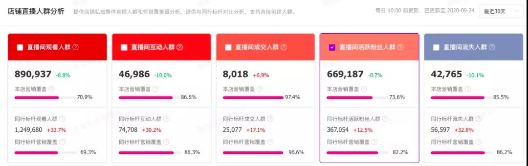 主要内容包含店铺直播洞察、行业直播分析。在店铺直播洞察层面,提供直播间观看、互动、成交、活跃粉丝、流失人群的分析,将本店与同行业的数据进行对比。