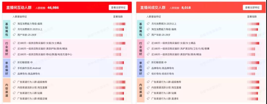 并进一步洞察直播人群的显著特征,从人群基础属性、行业偏好、单品偏好、内容渠道4个维度来分析;继而进行人群looklike拓展,人群推送。