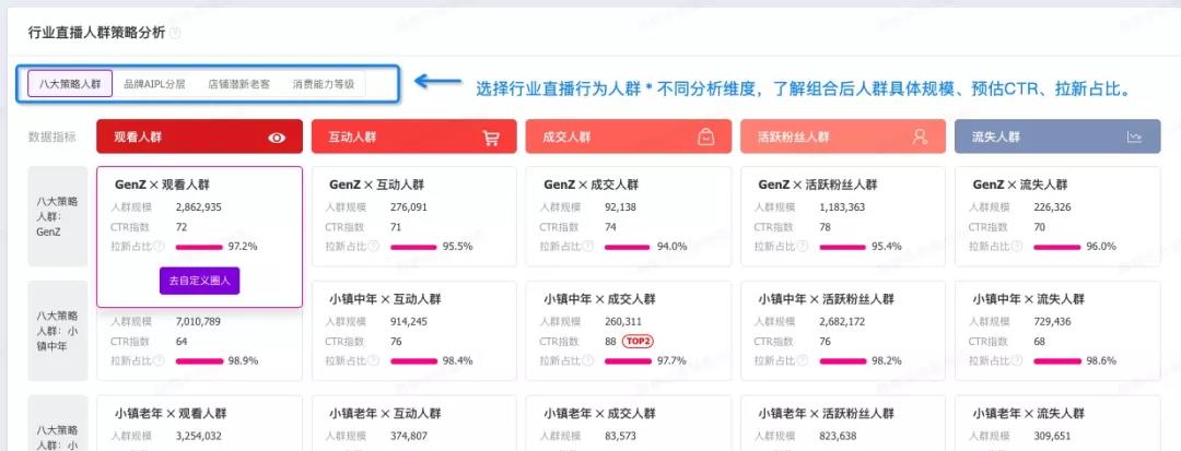 在行业直播洞察模块,增加了一些运营模型、运营方法论,划分八大策略人群、品牌AIPL分层、店铺潜新老客、消费能力等级,来进行分析。