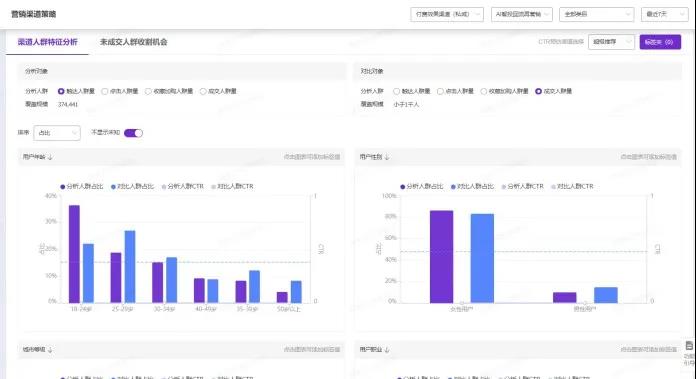 营销渠道策略分析:分触达人群量、点击人群量、收藏加购人群量、成交人群量几个维度,来查看用户年龄、性别、城市等级、职业、消费能力等级特征,进行人群间的对比,来细化不同阶段的人群投放策略。