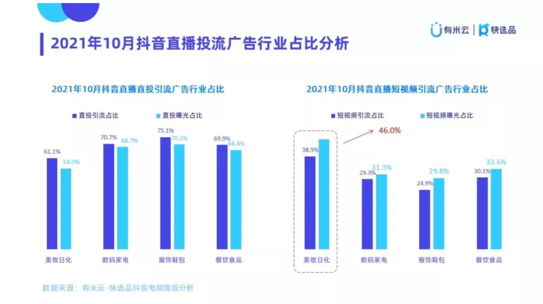 我们可以看一下10月份有米云公布的抖音直播投流广告行业占比分析,其中短视频引流占比基本过半,其中美妆日化行业更以38.9%的广告量占据46%曝光,短视频引流的玩法以及非常纯熟。