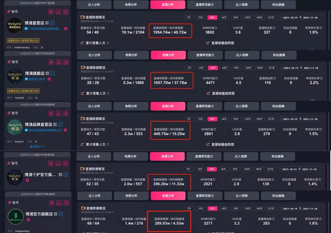 据有米云统计,博滴官方直播间一场直播的投流广告多达87条,素说美丽官方旗舰店在11月3号的直播开播不到6小时,就放出25条广告,掌握巨量千川玩法的新品牌完全不输老品牌,增长凶猛。