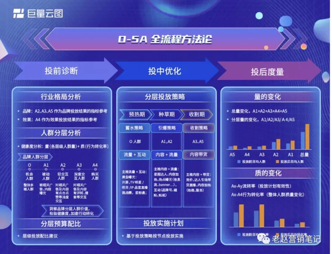 1)投放品牌广告,重点是关注品牌A2/A3/A5人群量级的变化,以及O-5A人群流转情况;