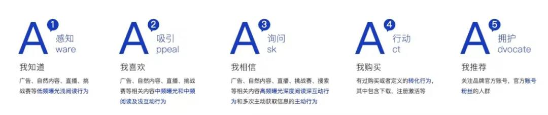 简单来看,A1的人群,可能是抖音或头条上的内容消费者,刷到了看到了某个品牌相关的内容;A2的人群,可能是点开品牌的短视频看了看,或者进直播间呆了一会儿;A3的人群,可能已经有频次比较高的品牌互动,甚至私信咨询了问题;A4的人群,可能是在品牌的抖音小店下单买了东西;而A5的人群,则是关注了品牌账号,成为品牌的长期感兴趣者甚至拥护者。