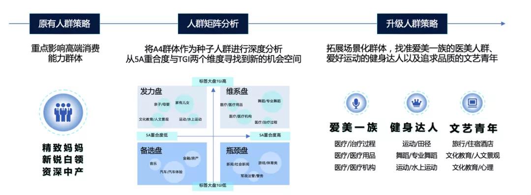 按照最佳实践,其O-5A营销的第一步是定位高潜人群。他们以A4为锚定目标,借助巨量云图提供的工具,将拉新人群划分到维系盘、发力盘、瓶颈盘和备选盘。最终发现,品牌现有存量人群以精致妈妈、新锐白领、资深中产为主,同时确定了高流转率的医美人群、健身达人和文艺青年这三个高潜人群。