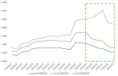 部分读者可能会有疑惑:这样的数据划分标准是如何制订的呢?为什么A3既有主动搜索人群,也有多次被动观看的人群?我特意就这点仔细了解过。实际上,各阶段人群划分的标准,是遵循了"数据实证"的原则,以各阶段人群之间,成交转化率存在明显差异为划分标准。而目前采用的数据标准,是在不同行业上的抖音小店数据或客户回传数据做过全面验证的。大家可以看看下图的数据。