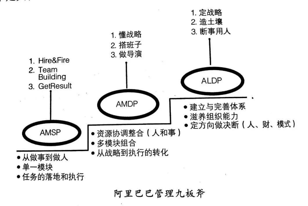 - 头部三板斧是定战略、造土壤和断事用人,这是定方向和做决断的层面,用于培养高层的组织能力和建立完善的体系。