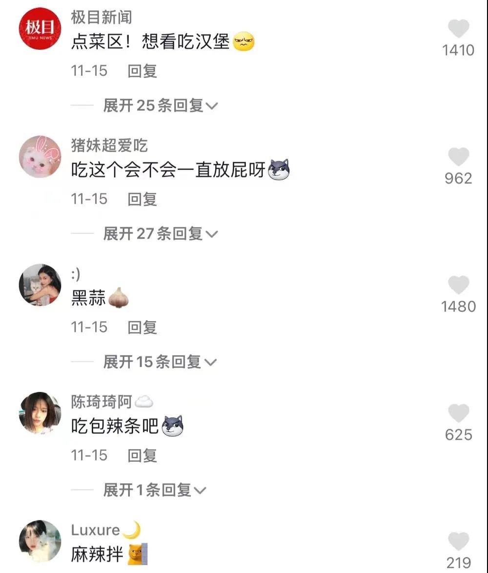 在车里吃个水果也许大家还能接受,但在车里吃螺蛳粉、吃苦瓜、吃豆腐脑,吃一整根水萝卜、甚至还有人建议吃榴莲、臭豆腐、汉堡、吃辣条等,粉丝开始把自己的想法强加到博主身上了,这就有了互动。