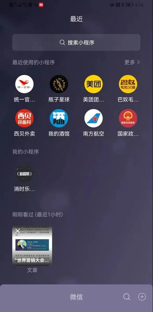 下面是我的小程序菜单,高频小程序都在首页。因为小程序太多,抢占"首页"是很困难的事,抢占不了"首页"就要搜索或者在众多小程序中寻找。