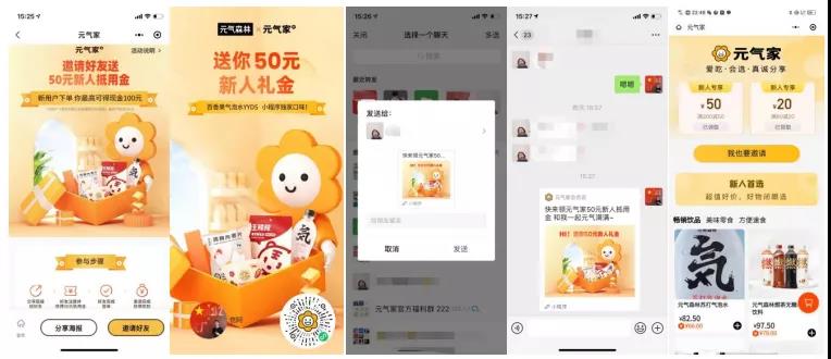 元气森林仅完成"拉新-引导-转化"的单线过程,可进一步完善为"拉新-引导-转化-再分享-再拉新"的良性闭环,即新用户下单完成后,可分享链接给好友,受邀用户可获得大额券包。在这一过程中: