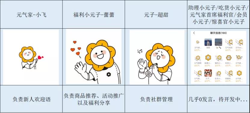 人设打造为一个充满元气、活泼可爱、有活力的形象,头像采用一系列"微笑花朵"的卡通人偶,昵称:元气家-xx/xx小元子。
