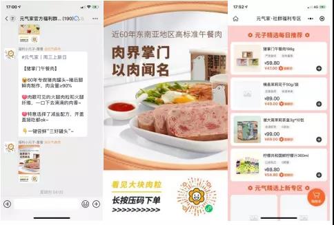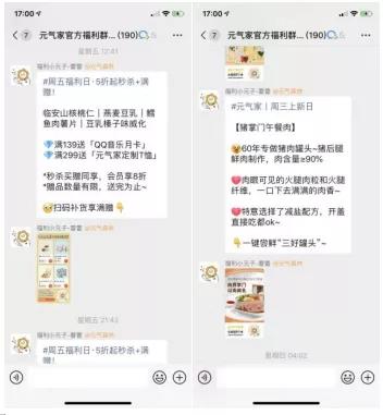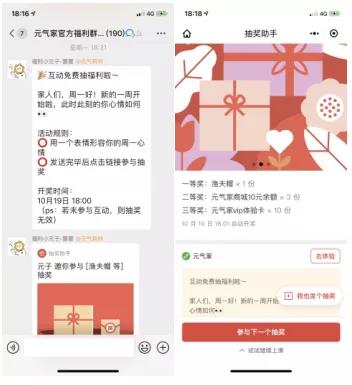 每日抽奖互动,发放优惠券引导再次转化:完成首单的用户,会进入"元气家|粉丝官方福利群",社群内每日有抽奖活动。