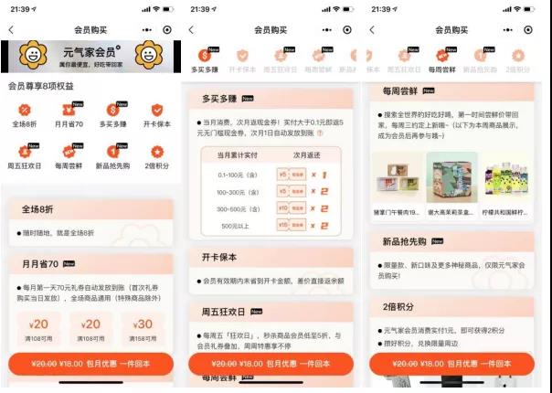1张月卡18元,商品原价129.9元/份,会员价103.92元/份,立减25.98元/份,由此可得,优惠金额已大于购买会员所付出的成本。