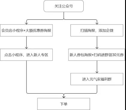 元气森林通过在引流的每个环节设置大额优惠券,引导用户从加企微号到进社群,最后完成首单,整个流程体验下来比较顺畅,步步放钩,值得学习。