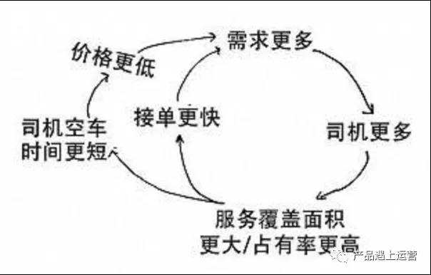 司机增加了,于是开始从服务和价格两方面展开竞争,进而带来更低的价格和更好的服务,进一步提升了乘客的打车体验,从而驱动更多的乘客开始使用Uber……