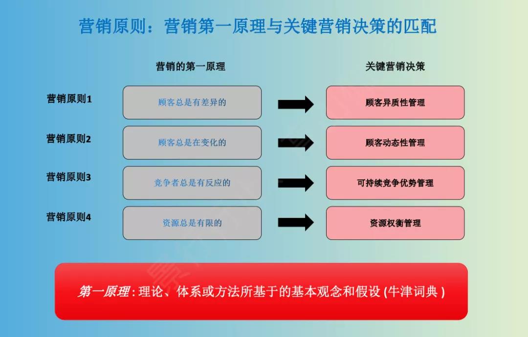 那么,市场营销的第一原理有哪些?我们看下图中有几个最基本的原则,我们把它称之为第一原理。针对这些原则,我们才有了关键营销决策的匹配。