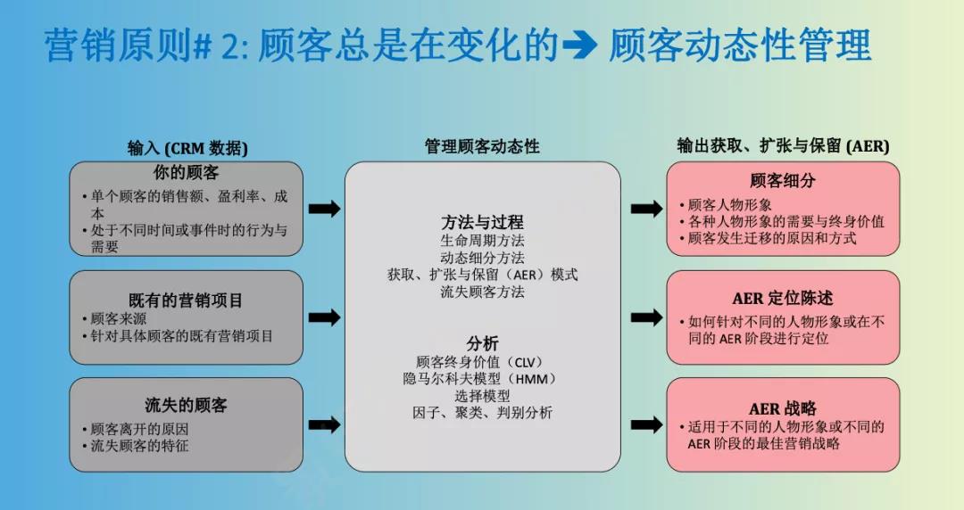 营销原则2是“顾客总是在变化”,所以我们要注意这些变化对营销决策的影响,营销人就是要在消费者不断的变化当中寻找市场机会。与之对应的关键营销决策就是“顾客的动态性管理”。