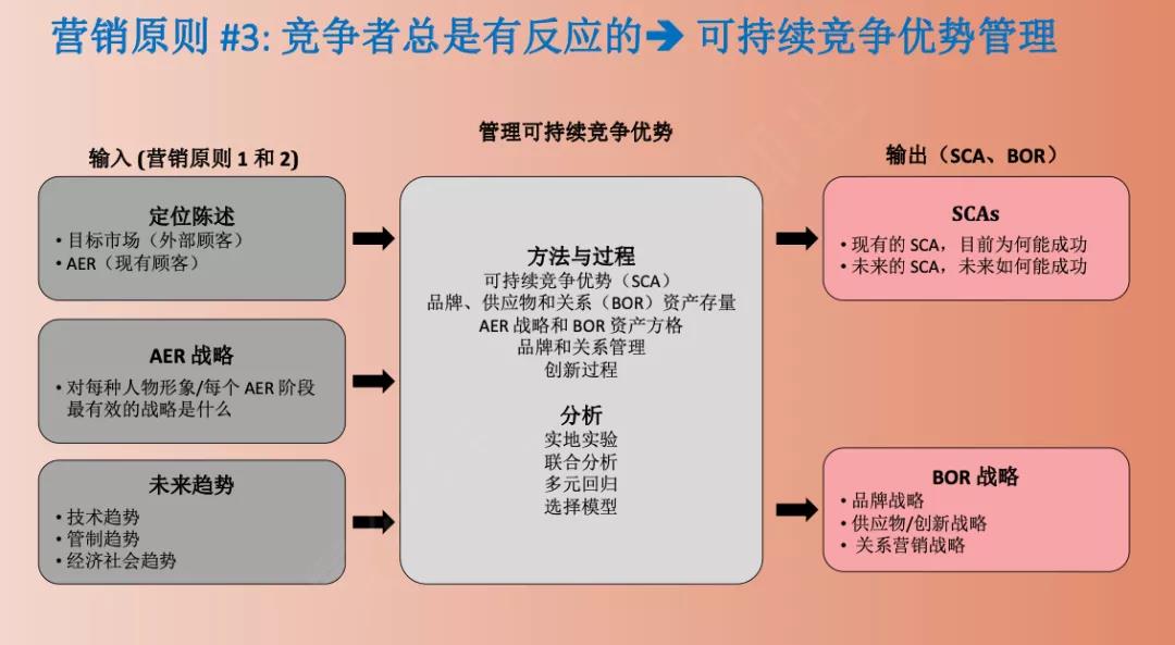 营销原则3叫做“竞争者总是有反应的”,没有竞争也就没有营销了,所以营销这门学科一定是顾客导向的,但是一定是面向竞争者,所以就有了“可持续竞争优势的管理”。