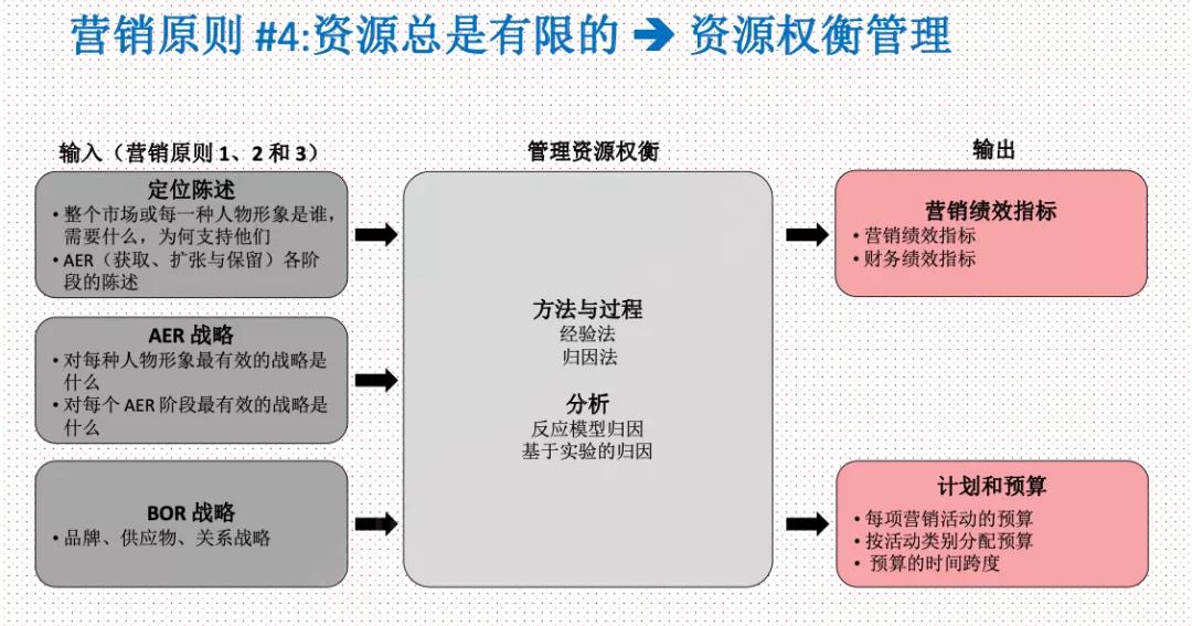 这一点不多说,关于资源权衡的管理,指的是企业要实时地关注营销绩效的一些指标和计划预算的执行情况。