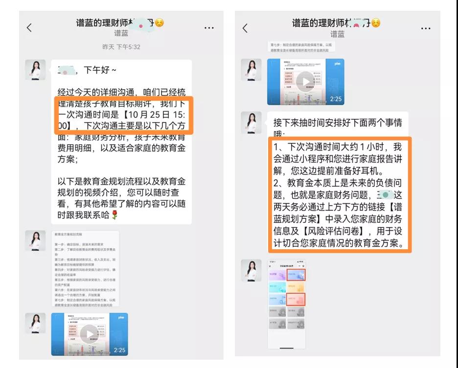 基于互联网保险需要深度沟通并建立信任基础才有机会转化的前提,谱蓝通过理财师1V1多次电话和用户直接深度沟通,了解用户家庭详细情况后