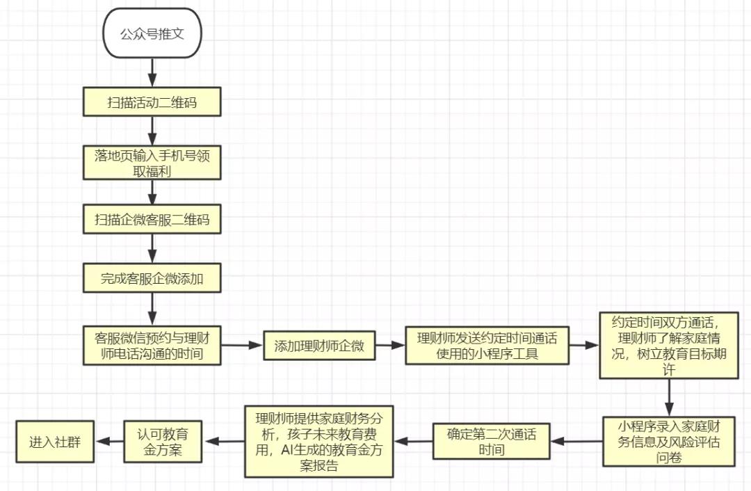 体验谱蓝理财-教育金规划定制服务的整个引流流程,无论是微信还是电话沟通,都是1V1服务,时间和人力成本投入比较重,也不存在用户沉淀和再教育的规划。