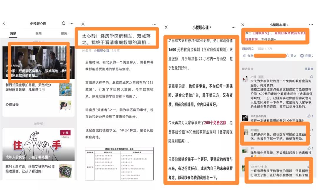 2)公众号推文:标题"太心酸!经历学区房翻车、双减落地,我终于看清家庭教育的真相....",通过当下"学区房、双减"的热门话题
