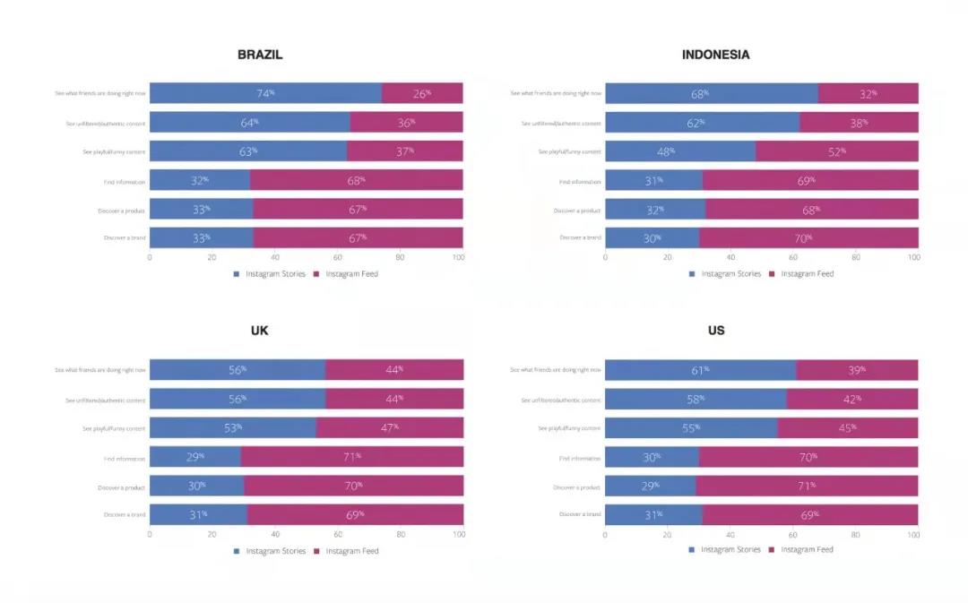 其中一项结论就表明,这四个国家的用户在两种情况下会使用story快拍而非动态。其一,当他们想要知道好友的实时动向时,说明story更能够拉近人们的亲密关系,其二是他们想看到未经筛选的真实内容时,这些内容可能是日常生活中的点点滴滴,甚至是"非常普通的时刻"。