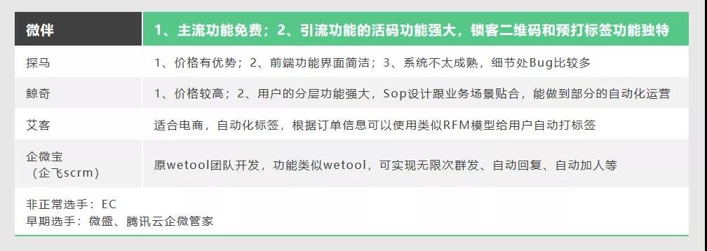 市场上,主流的SCRM系统主要有这些产品,相对来说,微伴更加经济实用;鲸奇虽然价格高,但在用户的分层,SOP设计和业务场景比较贴合,能够做到部分的自动化运营;艾客非常适合电商类的私域使用,自动化标签,可根据RFM模型自动给用户打上标签;句子互动也是一款不错的SCRM工具,无限制群发,一人可同时管理多个企微,流程管理,内容管理,用户管理相对来说比较智能。