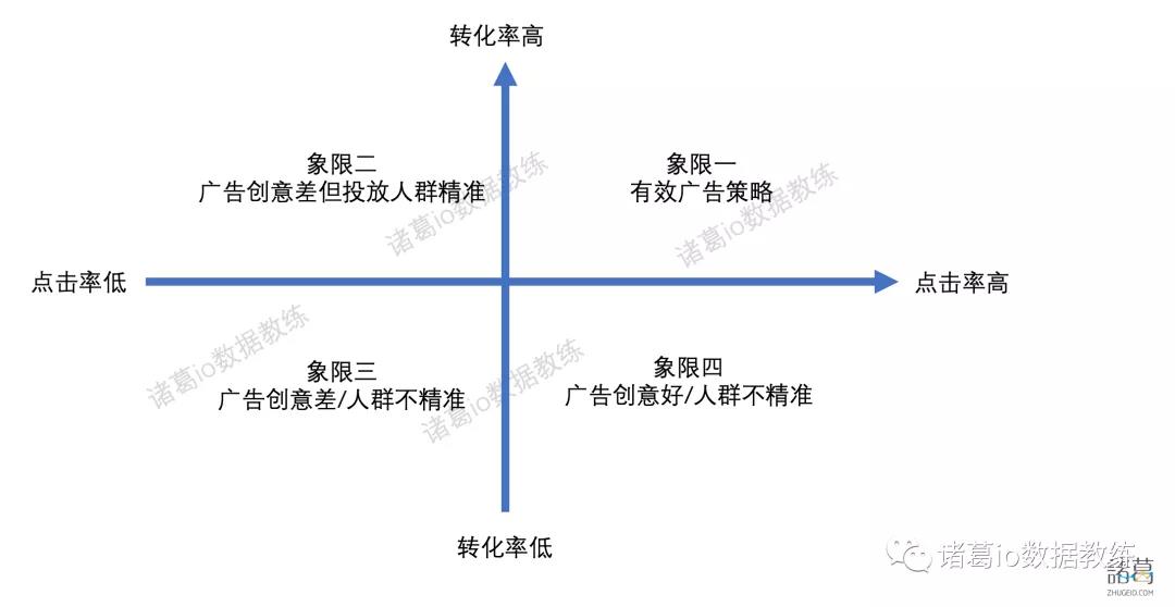 X轴从左到右是点击率的高低,Y轴从下到上是转化率的高低,形成了4个象限,这就是我们要说的象限分析法。