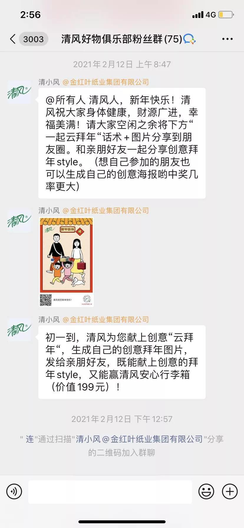 用户通过清风小程序内的活动页面,生成拜年海报,话术+海报图片分享到朋友圈。