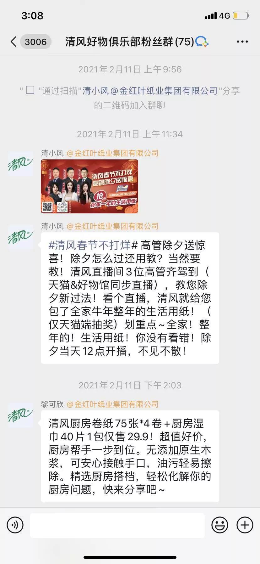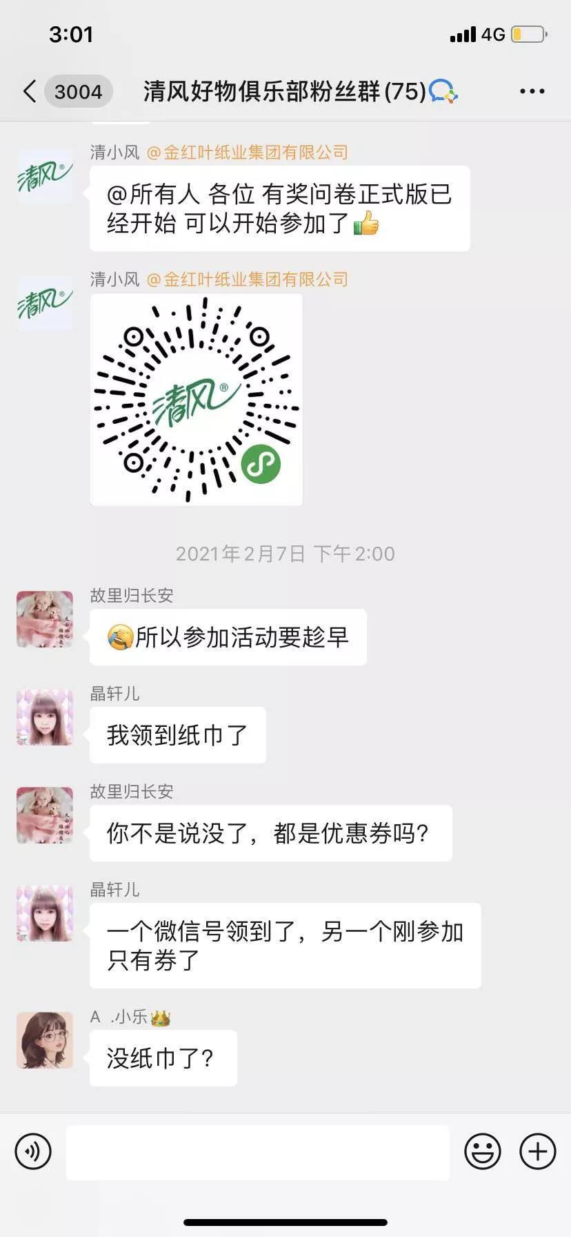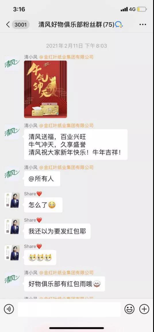 清风社群内的管理人员比较活跃,日常每天都会定时在中午和下午时段发送优惠信息,且群内的互动是比较不错的,用户的提问会得到快速的反馈,考验客服的信息反馈能力。