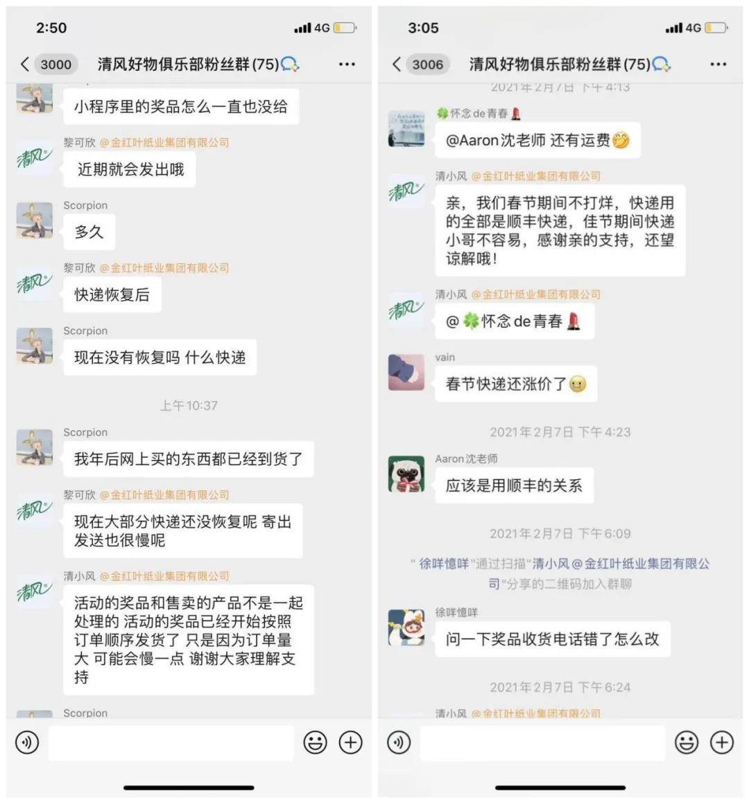 群成员在群内有物流、活动或产品问题,客服均会及时回复,给予反馈,让用户感受到自己被重视,用户体验优秀,促进用户留存。