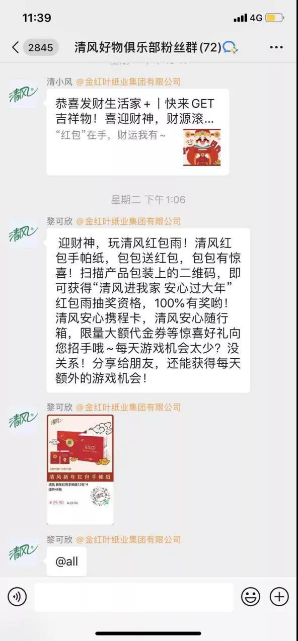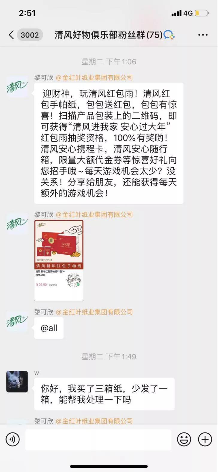 很多品牌社群内的内容推送以福利推送居多,主要为单向输出,但是清风社群内的双向互动是占多的,有奖问卷、红包雨和朋友圈有奖发送等活动,提高了用户对品牌的参与度以及用户对品牌的归属性,正是这种重视用户体验的行为,让用户牢牢成为品牌粉丝,提高粉丝忠诚度。