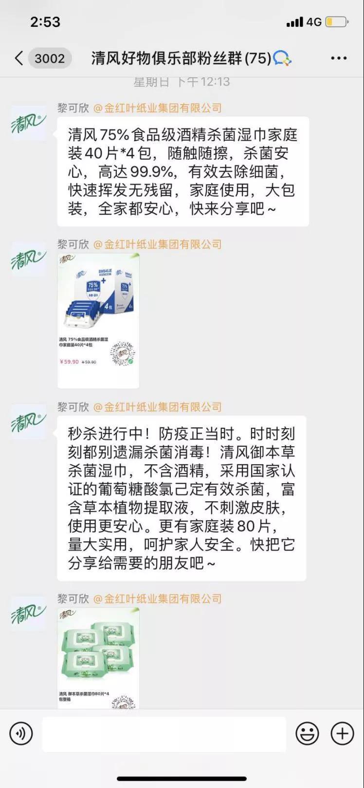 清风客服不定时在群内发送商品优惠,尤其是社会大众的关注的,比 如疫情时期人们关注杀菌消毒,客服便推荐相关产品,方便用户购买。