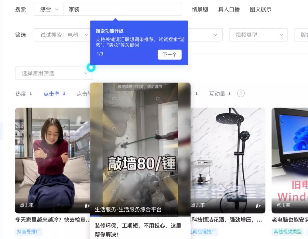 可以通过搜索产品关键词,按照热度、点击率、转化率等指标排序查看优质文案,同时,还可以结合配套的视频、落地页,分析主打的卖点和文案写法。此方法不仅适用于文案写法,也可以帮助梳理卖点的整体打法。注意,标题文案肯定是始终都要保持和视频主打卖点、落地页主打卖点保持一致的。