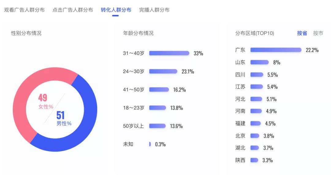 查看该视频的受众和互动人群画像,包含观看广告人群、点击人群、转化和完播人群。通过分析观看人群、点击人群和转化人群的差异,反向去调整计划定向,减少广告费浪费较多但转化差的人群定向,从而优化广告成本。