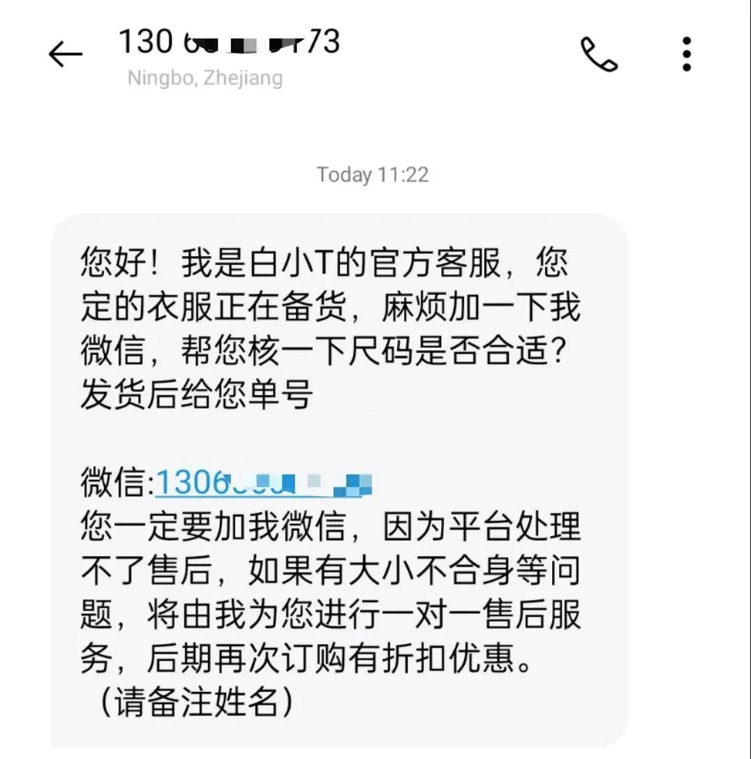 白小T在通过EPR订单拿到客户手机号码后,以核对尺码为由,引导加粉: