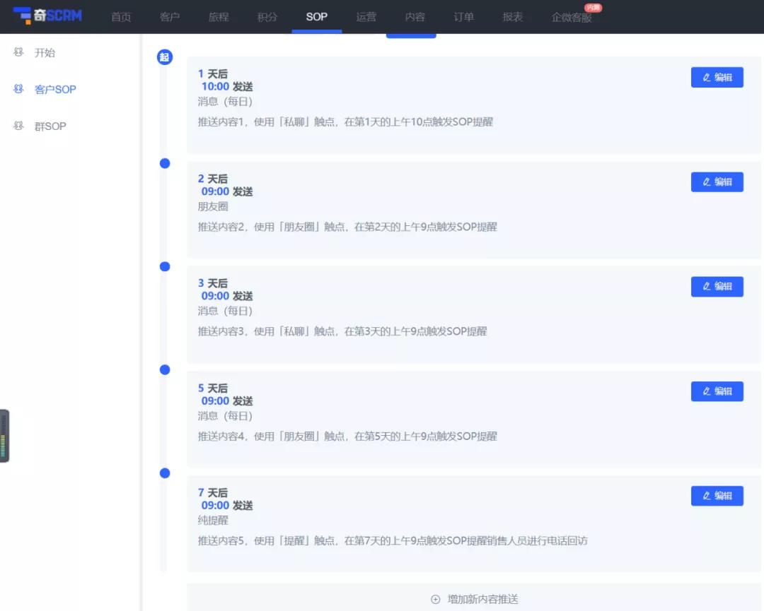 SOP永远是按照「相对时间」而非「绝对时间」(即临时性群发)触发的,也就是说,无论每天加多少人,这些人都会按照相对时间持续收到这些推送。