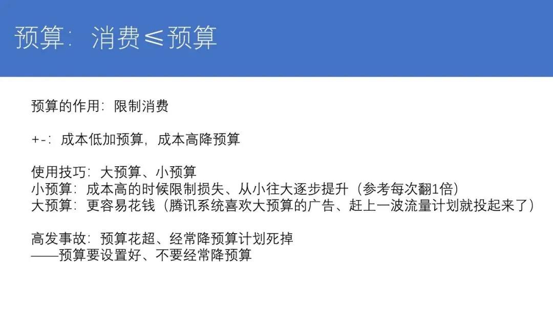 那这么做有没有用呢?我听到的说法是:腾讯系的广告系统是比较喜欢大预算的,如果你设置的预算比较高,这条广告就更容易花钱。