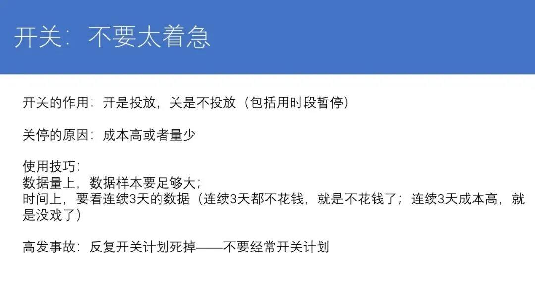 开关这个事情我觉得是能够反映出优化师的能力的,什么时候关计划是决定这个账户能不能跑起来的关键。