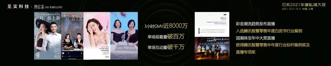 上图是潮宏基在2021年做出的成绩单。我们2021年进行了两场不错的私域直播,第一场是以"春上新"为噱头的新品直播;第二场是以官宣品牌大使为噱头的年中直播。这两场直播曾用3小时将GMV突破8000万,单场观看量破百万,互动量破千万。