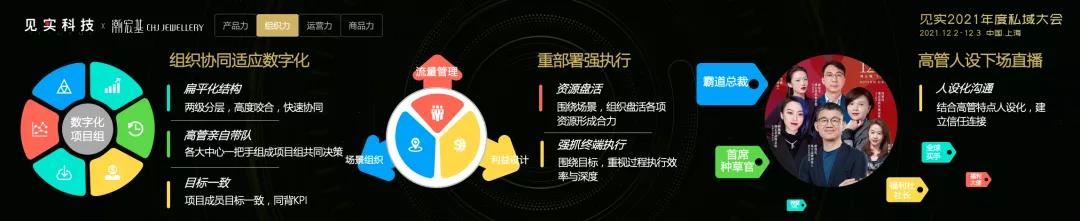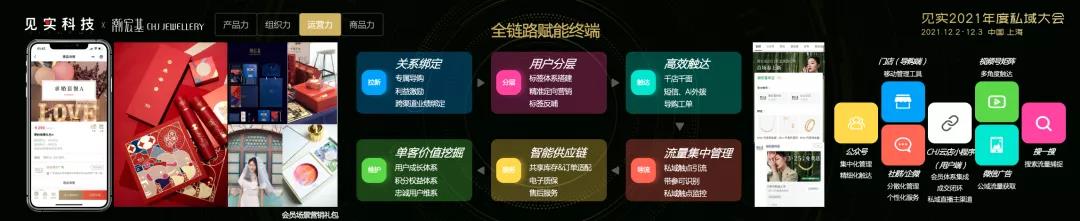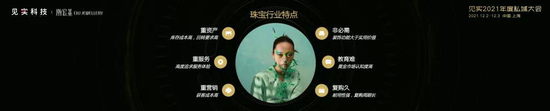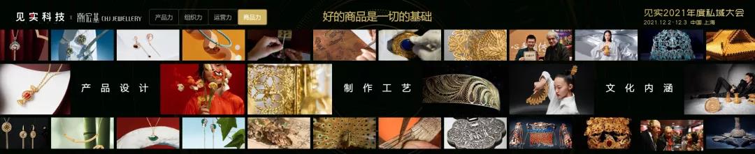 在刚过去不久2021见实年度私域大会上,潮宏基珠宝CMO林佩璇就带我们了解珠宝行业的基本特点,如非刚需、复购久、重资产、重服务等;还重点详细阐述了了潮宏基珠宝刚总结出的私域运营四力模型,包括产品力、组织力、运营力、商品力等四个关键维度。