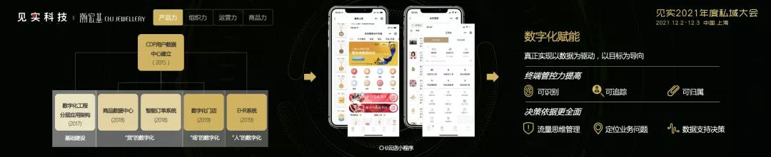 之所以能反应如此迅速,是因为整个潮宏基从2015年就开始了数字化转型,并建立起CDP(用户数据平台);2017年完成基础建设——数字化工程分层应用架构;2018年建立和完善了"货"的数字化——商品数据中心、智能订单系统;2019年则建立了"场"的数字化——数字化门店,以及"人"的数字化——EHR系统,实现了人货场的数字化。
