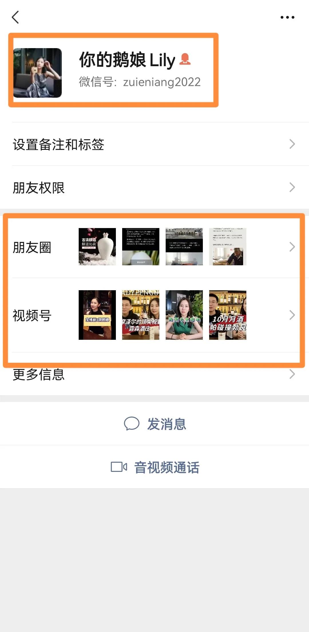 4)个人介绍:添加微信时,个人介绍中显示【朋友圈】和【视频号】,可以让陌生人迅速了解醉鹅娘的品牌形象。