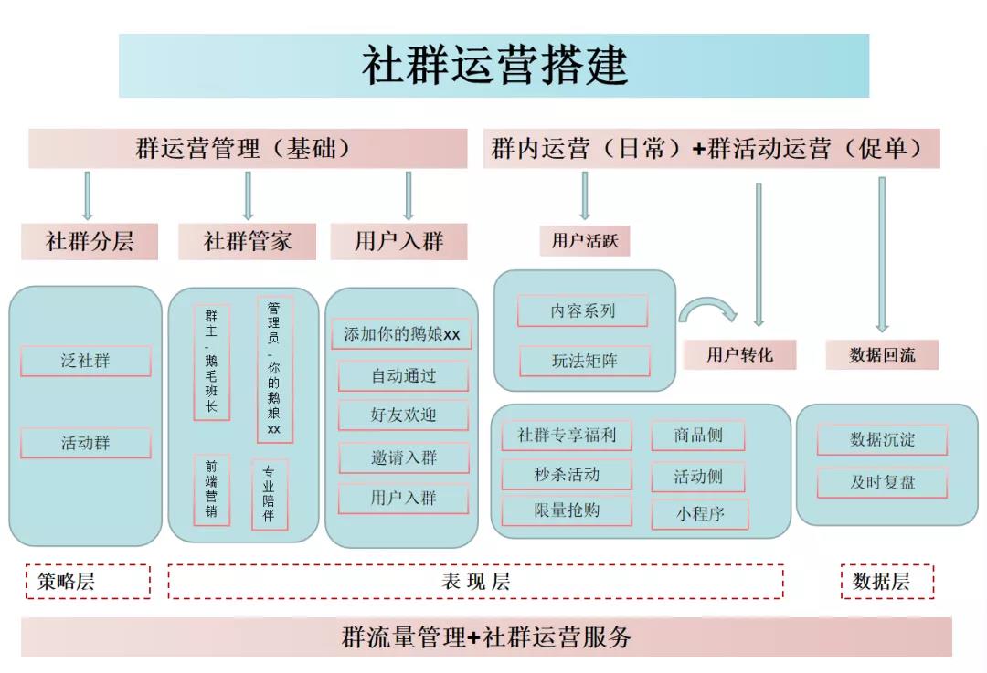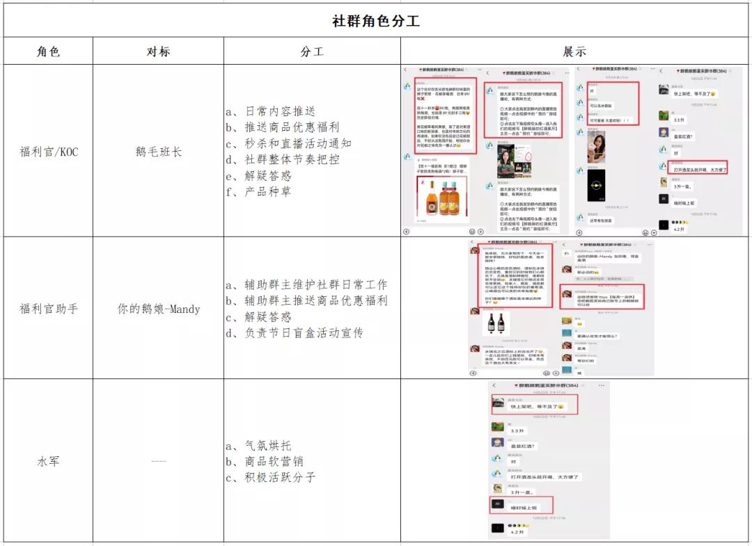 社群角色分工,采用"2+1"的模式,即以群主即福利官鹅毛班长为主,你的鹅娘-Mandy为辅,其他你的鹅娘-xxx作为第三梯队备选助手,共同维护社群秩序,给社群成员以发送优惠福利等方式种草,水军适时群内烘托气氛,最终达成用户付费转化的目的。