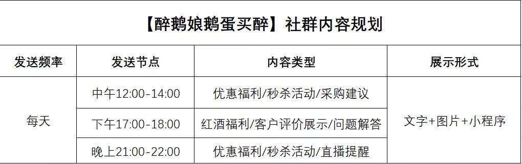 2)社群没有干货分享且缺乏互动话题,社群用户的忠诚度是由社群提供的价值决定的,建议每周安排2-3次红酒知识分享,逐步提升用户对红酒的兴趣和购买欲望。