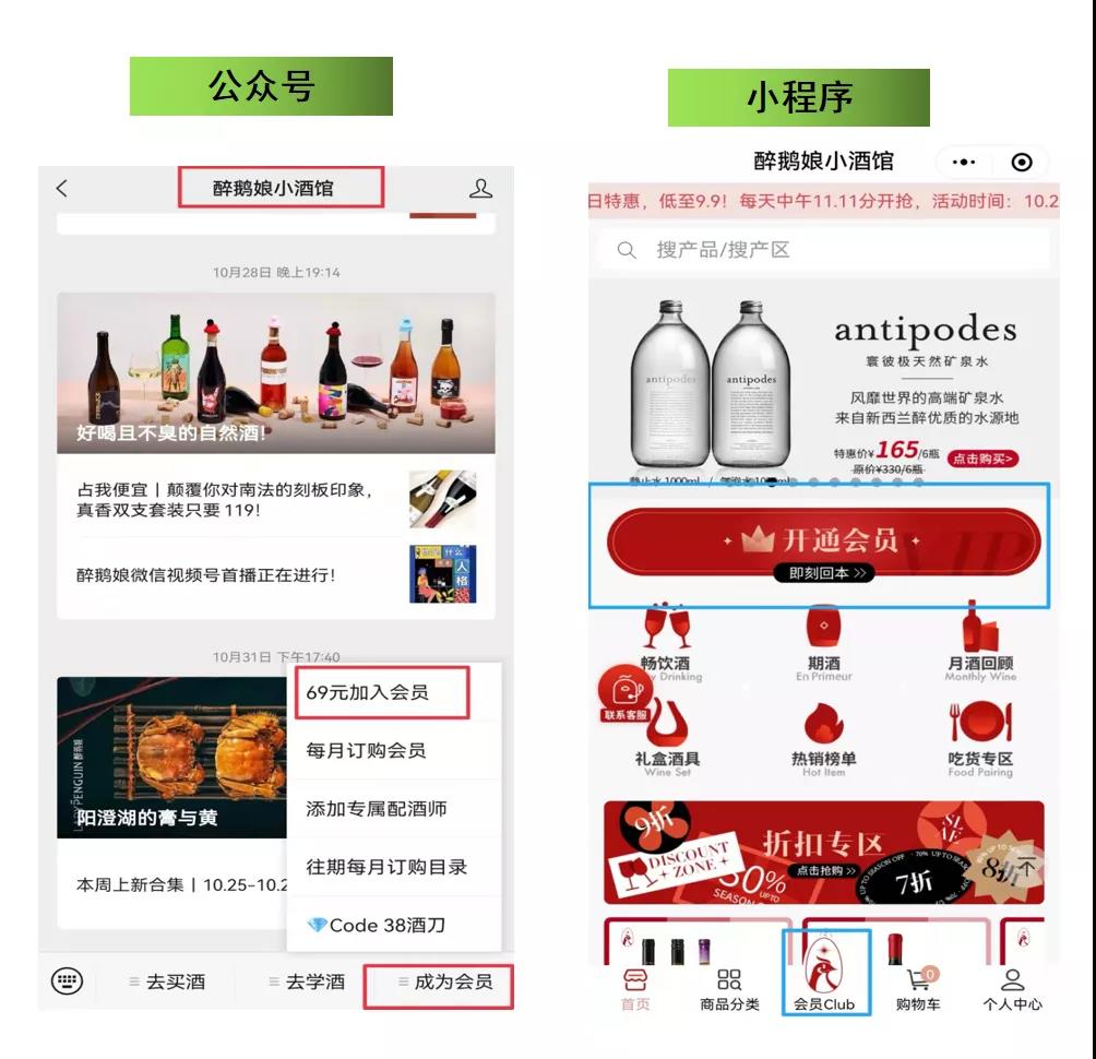 通过公众号和小程序【醉鹅娘小酒馆】,进行会员引流。
