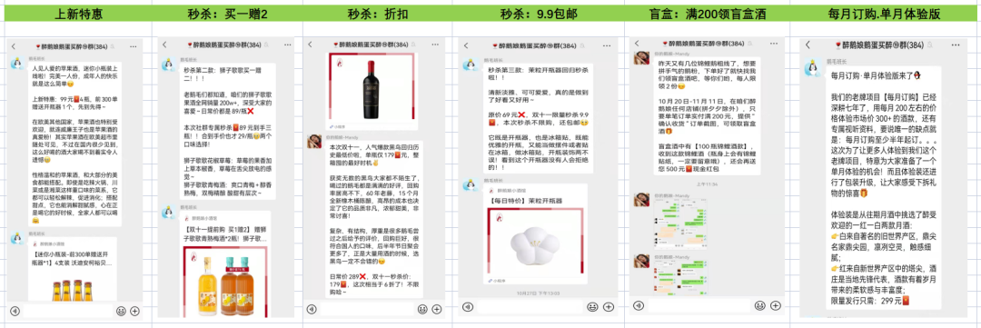 社群内没有设计促活话题,而是采用上新特惠、秒杀(买一赠2、折扣、9.9包邮)、满200领盲盒酒以及每月订购.单月体验版等促销策略来对社群进行激活。