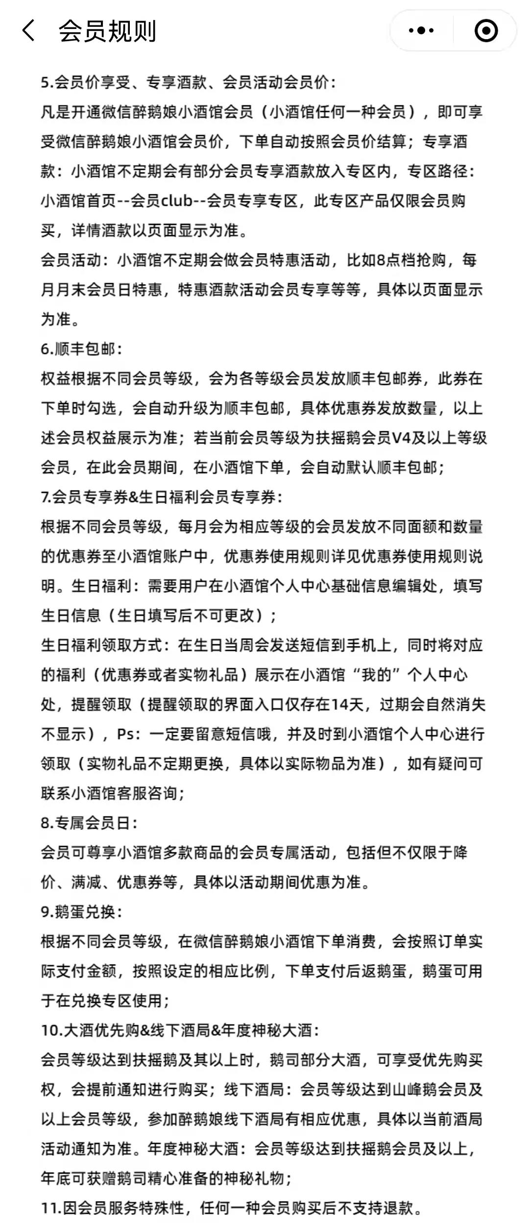 注册微信醉鹅娘小酒馆的用户,凡成功购买了沙滩鹅卡/每月订购,即可开通醉鹅娘小酒馆会员,并享受会员相应等级权益。