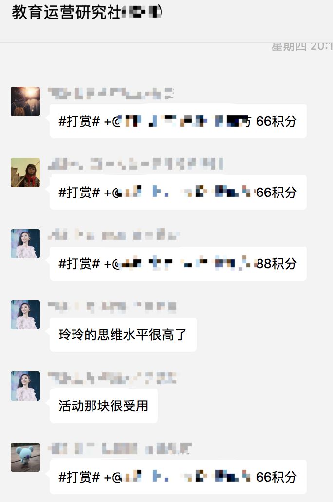 通过触发、行动、酬赏三个步骤,基本就能改变学员的行为,让学习变得持续,不过,使学员自发持续投入训练营的学习,显然更为重要,而据此可制定的策略,是将听课与打卡游戏化,根据PBL模型(点数、徽章、排行榜)进行设计,比如听课和打卡可获得积分或金币用来进行兑换,不同学习天数对应不同等级,定期更新打卡排行榜等,像运营研究社的社群就有比较系统的积分体系,可用于打赏等激励行为。